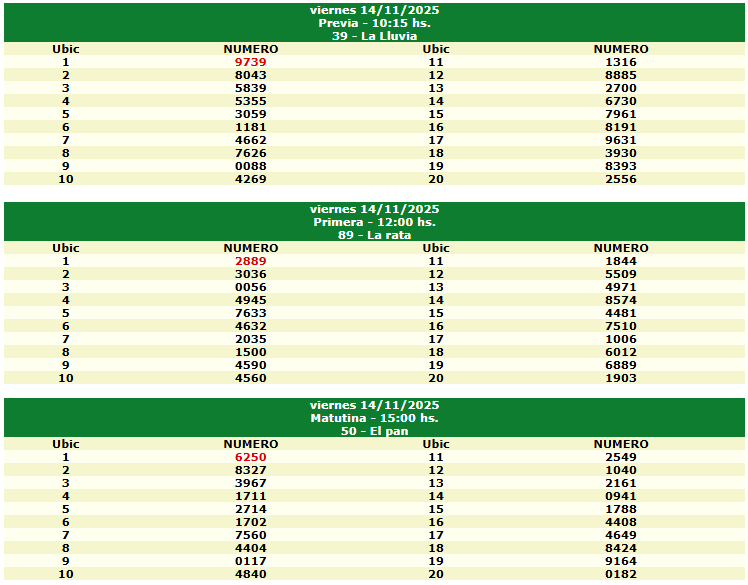 Estos números corresponden a los sorteos realizados en los turnos programados para hoy. Cada turno ofrece una nueva oportunidad de ganar, y los jugadores deben estar atentos para verificar si sus apuestas resultaron ganadoras.