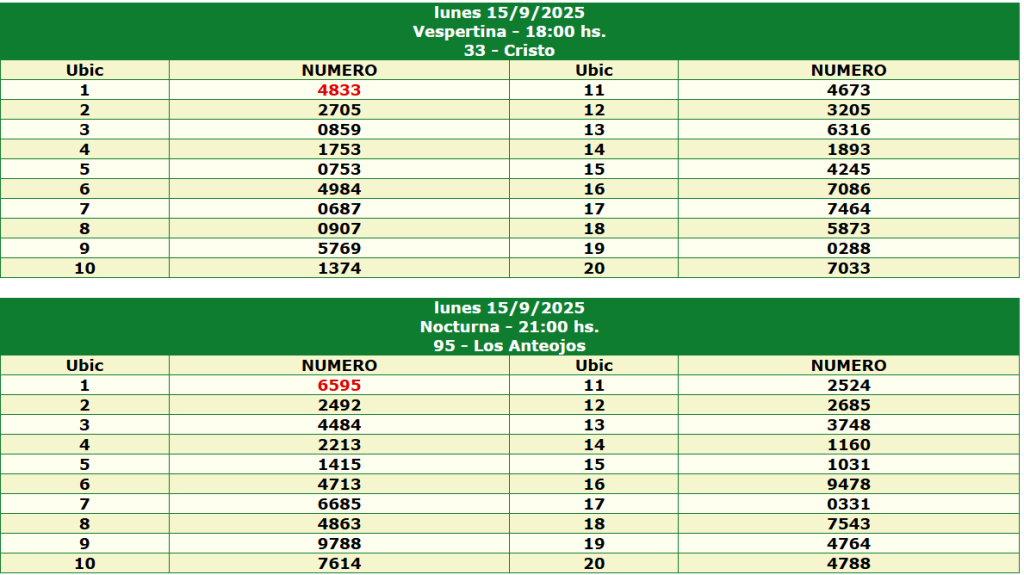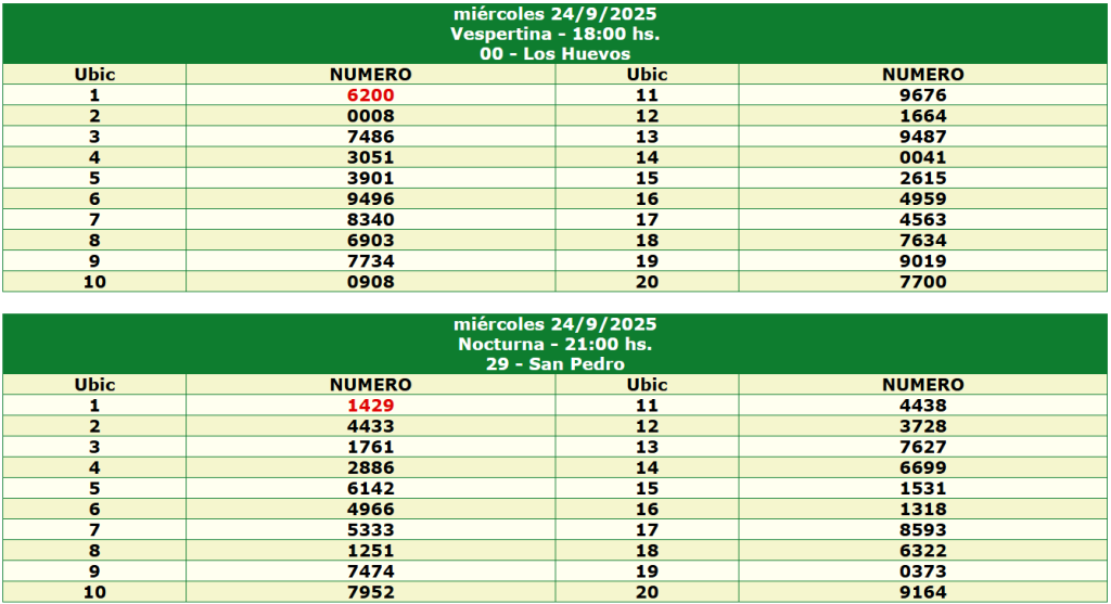 - Nocturna: El último sorteo del día, realizado a las 21:00 PM.